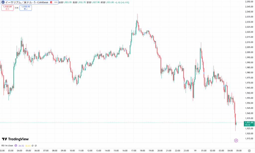 イーサリアムはビットコインと概ね似た推移で、夜間にかけて5%以上の下落をしました。