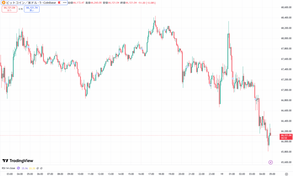 午前0時~午前5時にかけて6万8300~6万5815ドルまで下落しました。
