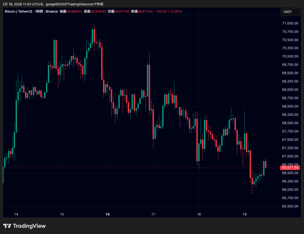 ビットコイン(BTC)は19日時点で6万6761ドル付近です。