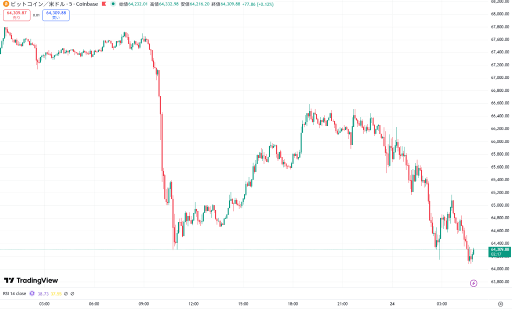 序盤にかけて6万7600ドル台まで上昇したものの、その後急落し一時6万4300ドル付近まで大きく下押ししました。