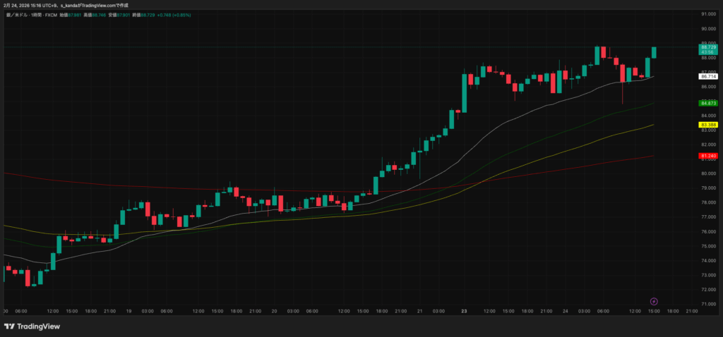 2月24日は86.8ドル前後へと小幅に調整しました。金が前日比で61ドル程度下げたのに対し、銀は値幅を比較的抑えたまま推移しました。