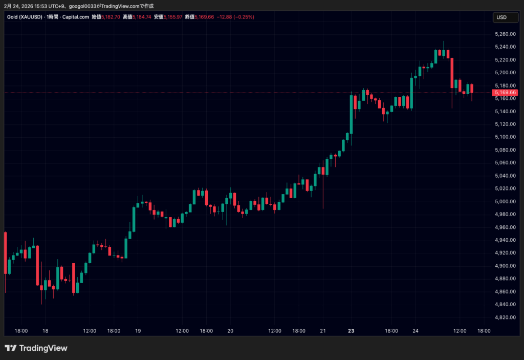 2月24日の市場は、ゴールドが高値圏を維持する一方で、ビットコイン(BTC)は戻りの鈍い展開となっています。