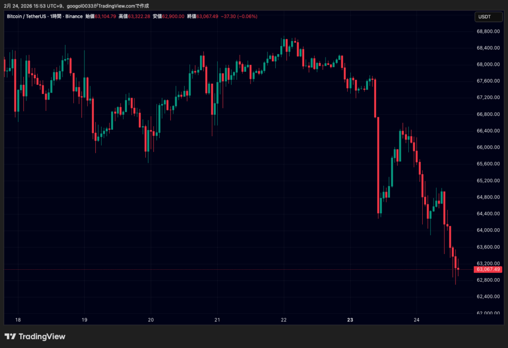 ビットコインは6万3000ドル台で推移し、足元は6万2949ドルです。