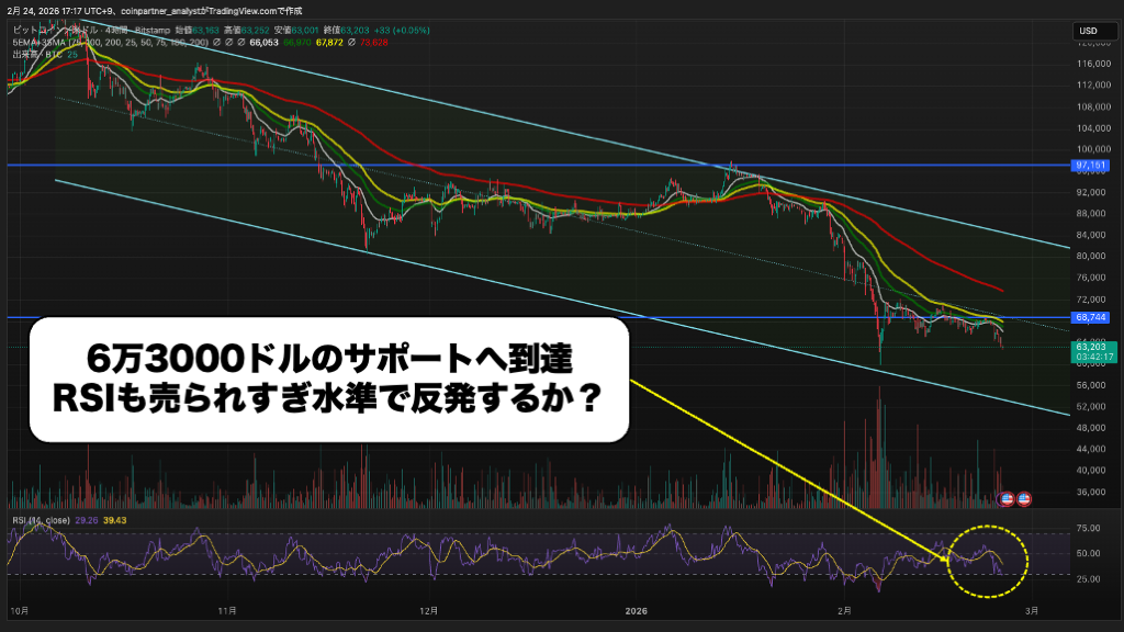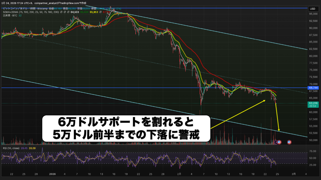 テクニカル的には、4時間足・1時間足ともにRSIが売られすぎ水準に到達しており、短期的な反発の可能性はあるものの、6万3000ドルのサポートを下抜けた場合は6万ドル、さらに下落チャネル下限の5万ドル台前半までの下落が視野に入るため、安易な逆張りロングには警戒が必要です。