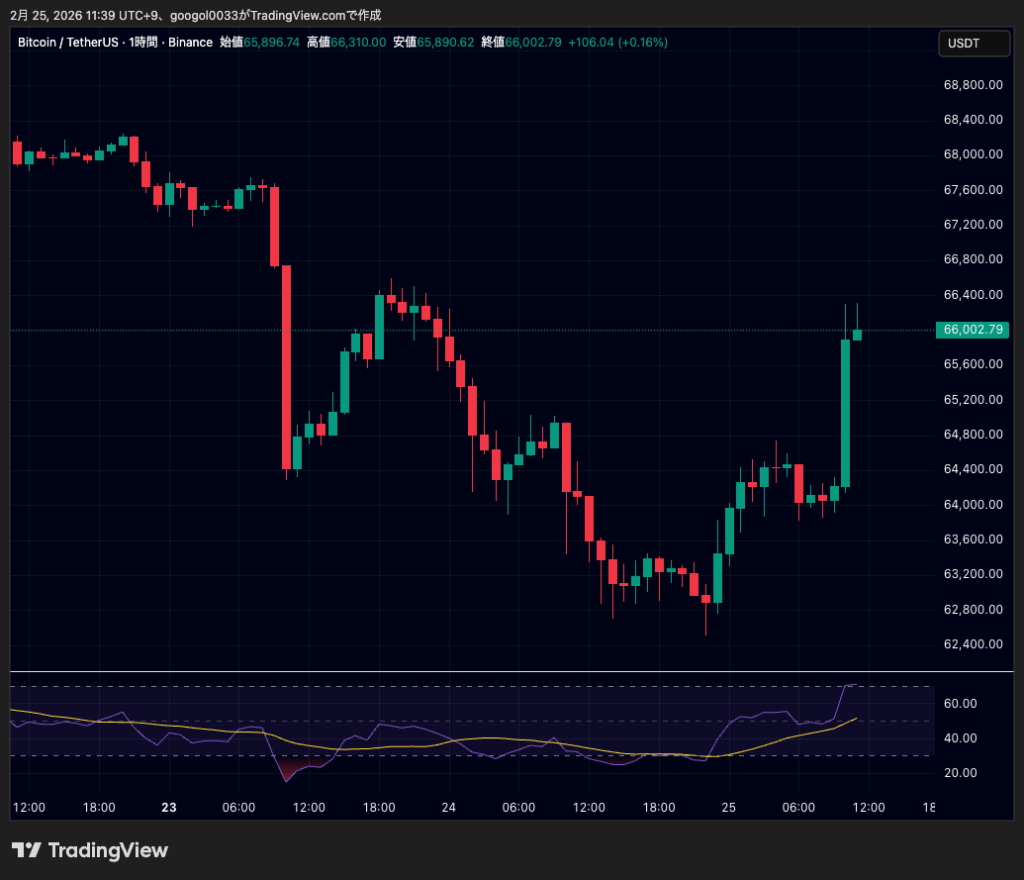 高値は6万6300ドル台まで伸び、足元では6万6100ドル前後で推移しています。