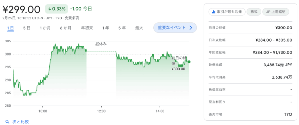 2月25日は前日終値300円に対して295円で寄り付き、序盤に284円まで下落しました。