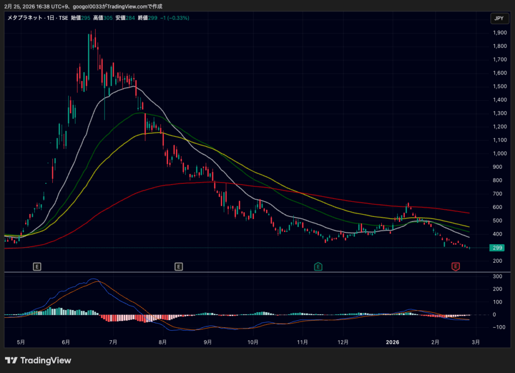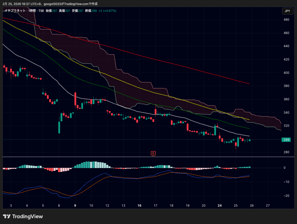 MACDは短期的に改善方向へ振れたものの、終盤は勢いが落ちています。次の確認点は、300円を回復した上で、その水準での推移が続くかどうかです。