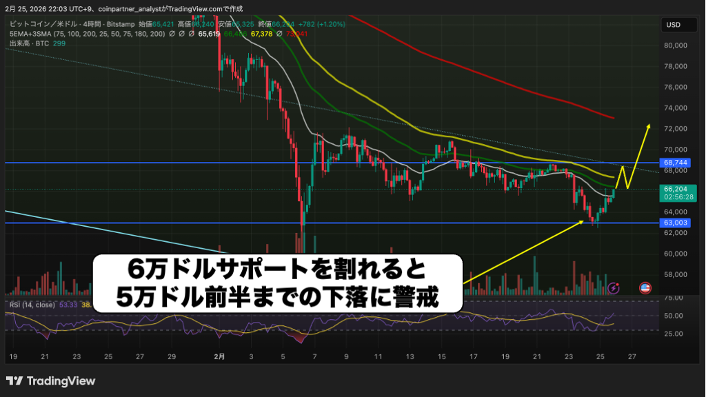 現時点では、6万3000ドルサポート→反発→6万8700ドルレジスタンスで一度抑えられる、というシナリオがメインです。6万8700ドルの攻防が今後数日の最大の焦点となります。