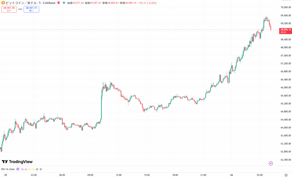午後9時~午前5時にかけて6万5387~6万9555ドルへ上昇しました。