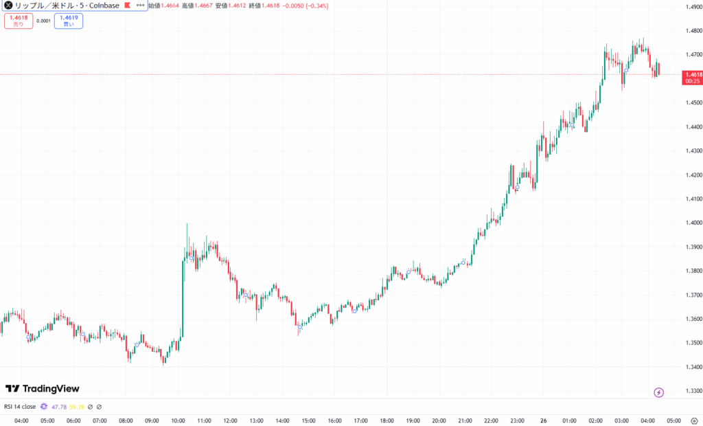リップルはビットコインと同様に午前中にかけて急騰後に調整がはいりました。