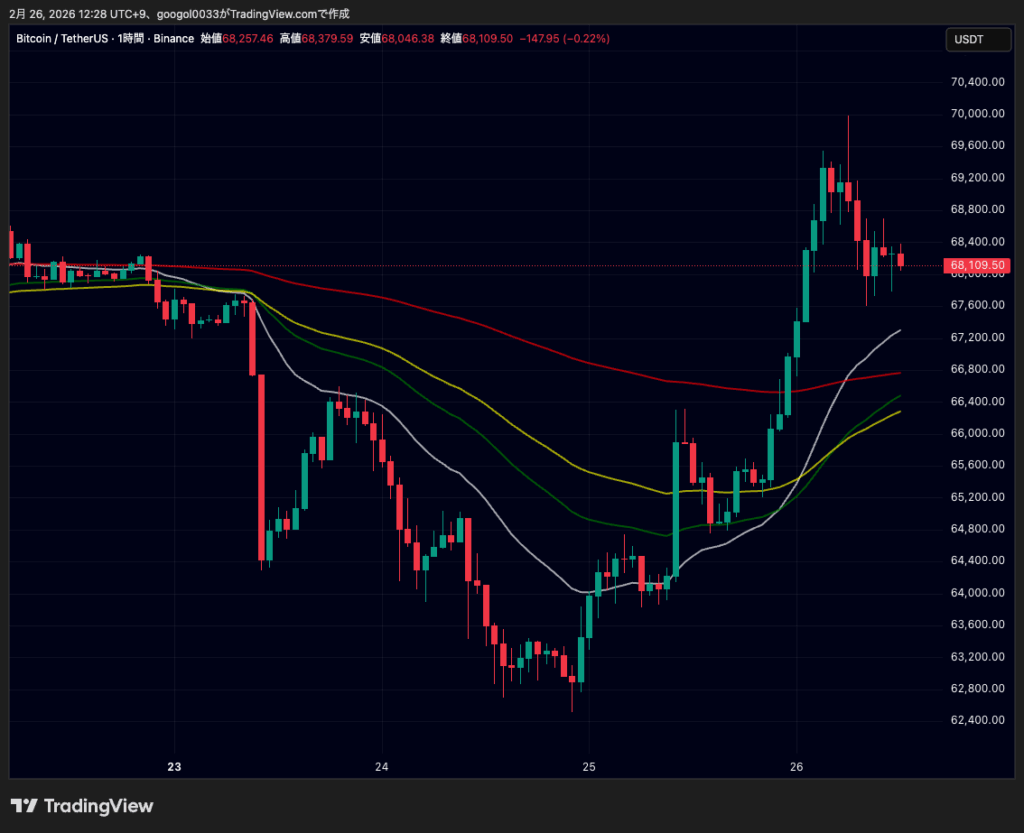 足元は6万8000ドル台で推移しており、26日正午時点で始値6万8248ドル、高値6万8351ドル、安値6万7779ドル、終値6万8281ドルでした。