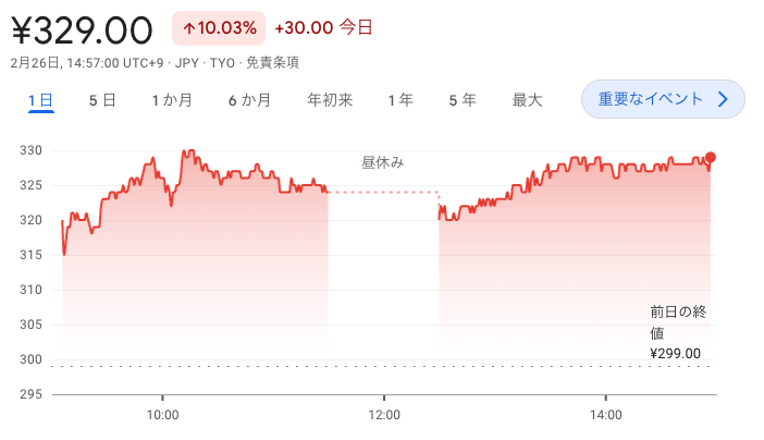 その後は買い戻しが入り、高値331円まで上昇し、終値は327円で取引を終えています。