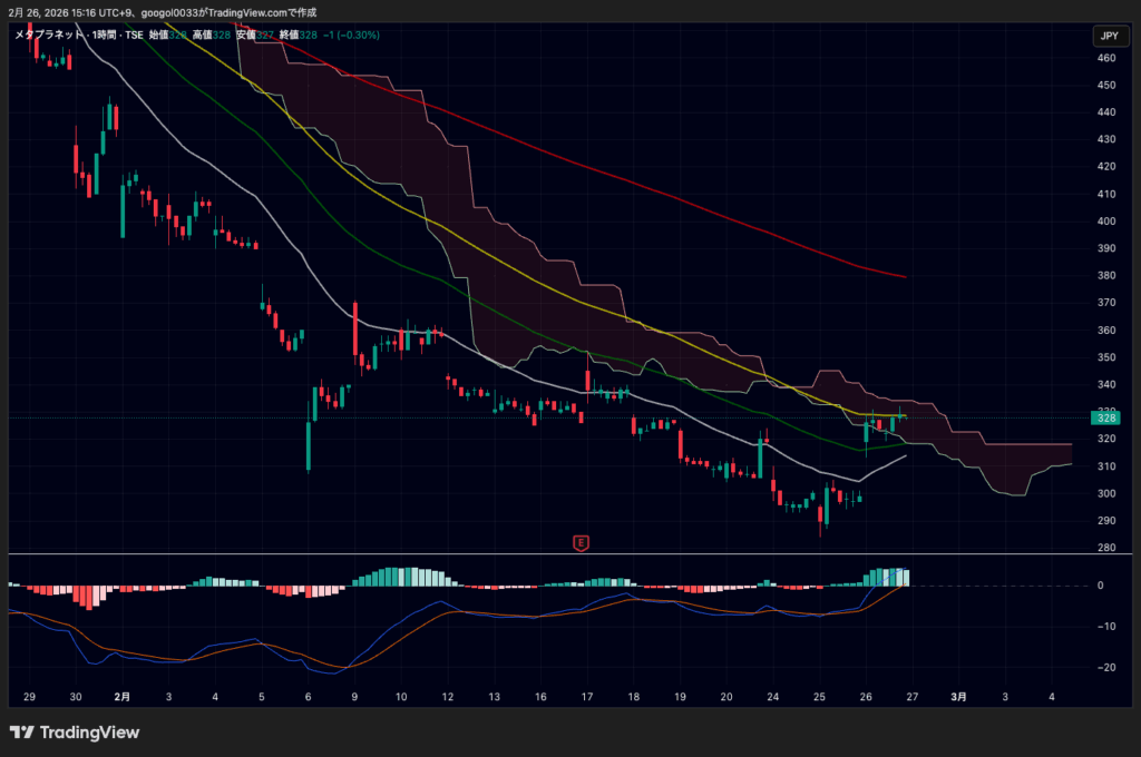 1時間足では、きょうの反発で価格が持ち上がり、引け前は328円付近での推移が確認できます。