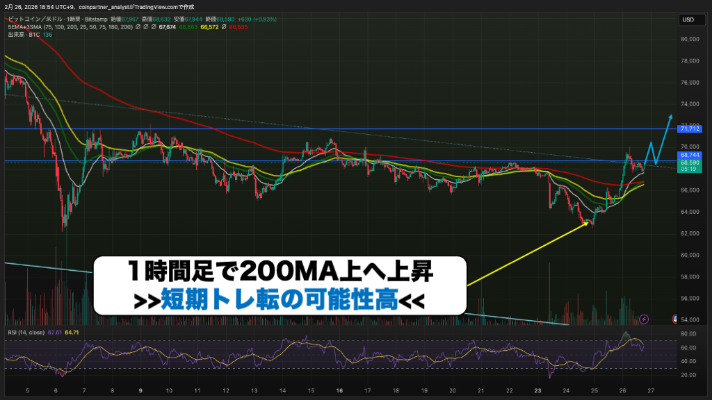 1時間足の短期MAと中期MAが接近しており、ゴールデンクロスが発生すれば短期トレンドの転換シグナルとなります。ただし、ゴールデンクロスだけで飛びつくのはリスクがあるため、7万2000ドルのレジスタンス突破を併せて確認することで、エントリーの精度が高まります。