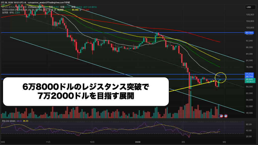 7万2000ドルを明確に上抜けした場合、次のターゲットは7万5000ドル付近となります。この価格帯を突破できれば、10月の高値からの下落トレンドラインに対する本格的な反発局面に入る可能性があります。