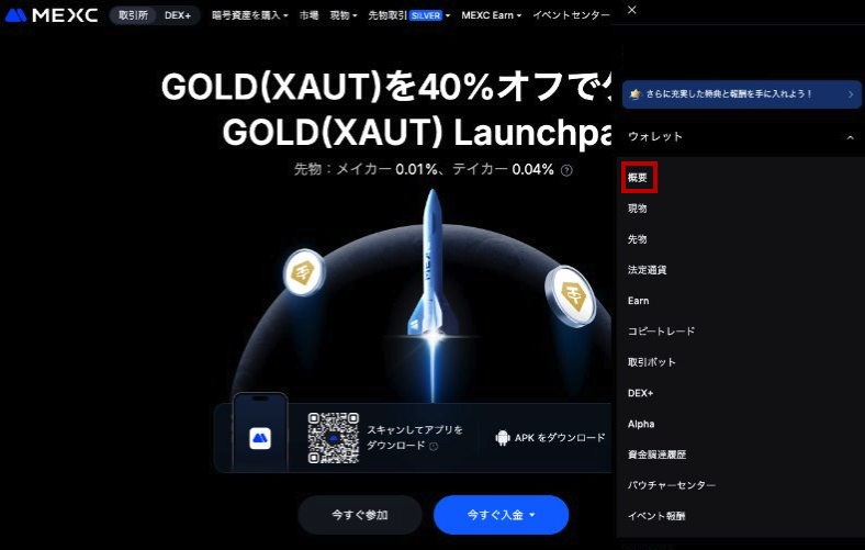 現物取引 先物取引 Kickstarter コピートレード MEXC Earn |