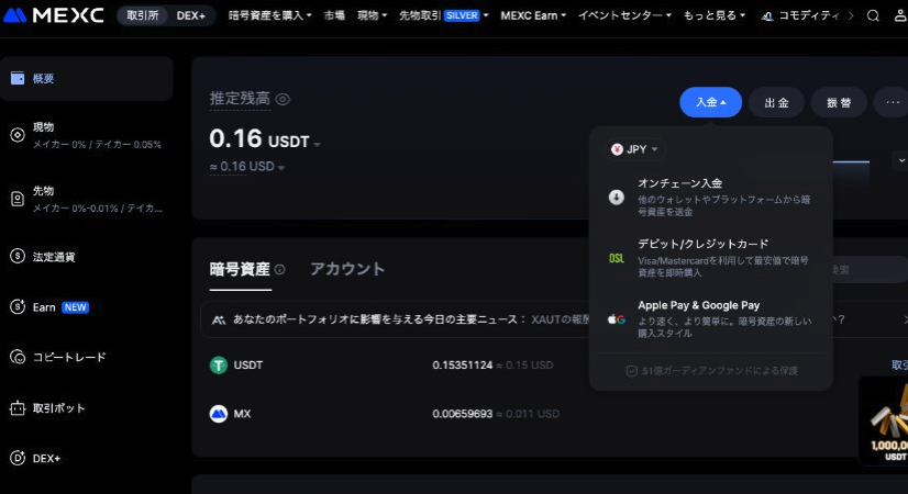 口座開設が完了したら、サナエトークンの購入に使うUSDT(テザー)をMEXCに入金しておきましょう。