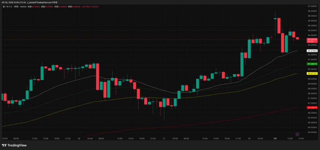 銀スポットも同期間に大きく上げました。2月28日は93.8ドル(+6.33%)まで上昇し、3月1日は93.8〜94.3ドル(+7.67%)を示しました。