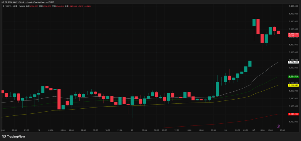 2月28日から3月2日10時までの金スポットは、2月28日におよそ1オンス当たり5,230〜5,247ドルで始まった後、同日に5,275ドル(前日比+1.75%)まで水準を切り上げました。