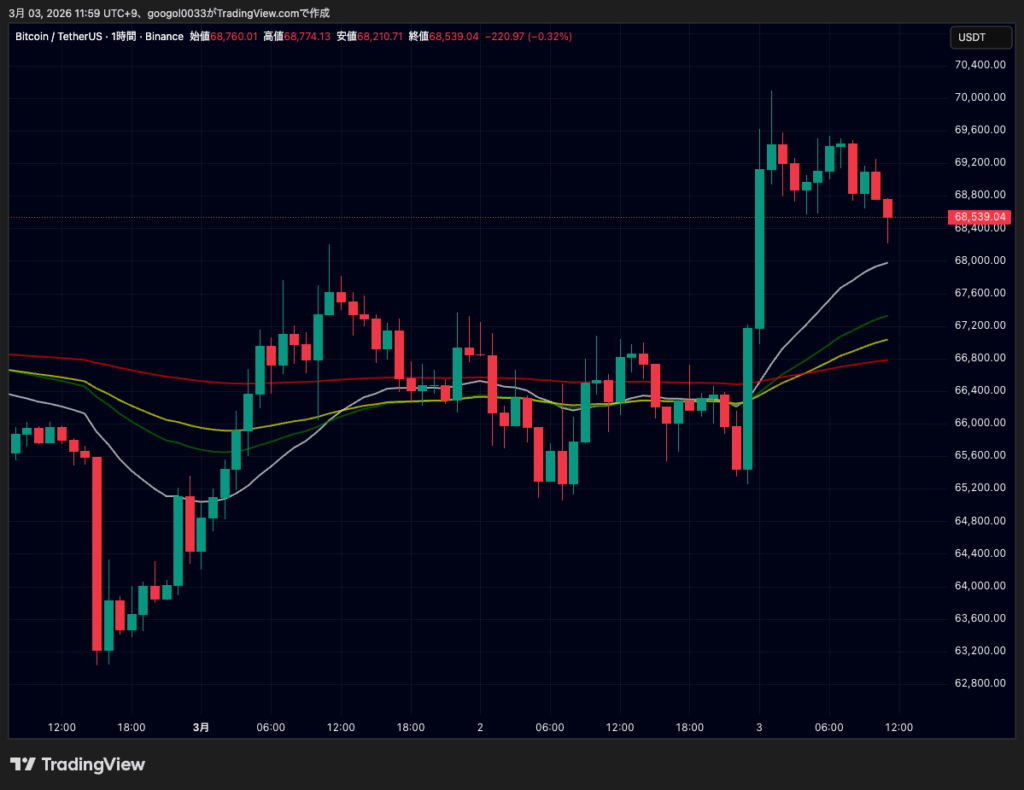 3月3日午前の仮想通貨市場は、ビットコイン(BTC)が一時7万ドルを突破した後、高値圏でのもみ合いに移る展開となりました。