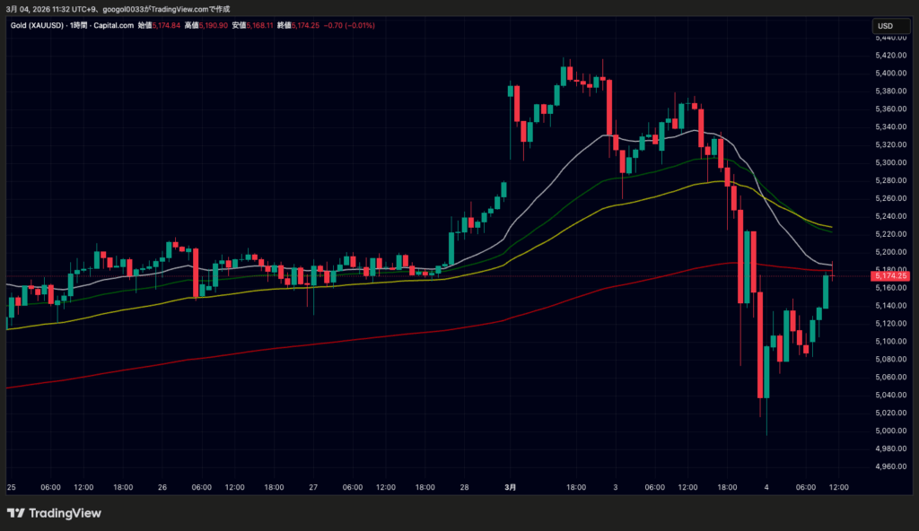 金は3月3日に売りが強まり、取引中に5000ドル台を一時割り込む場面がありました。終値は約5094ドルで、前日比で約4.46%下落しました。