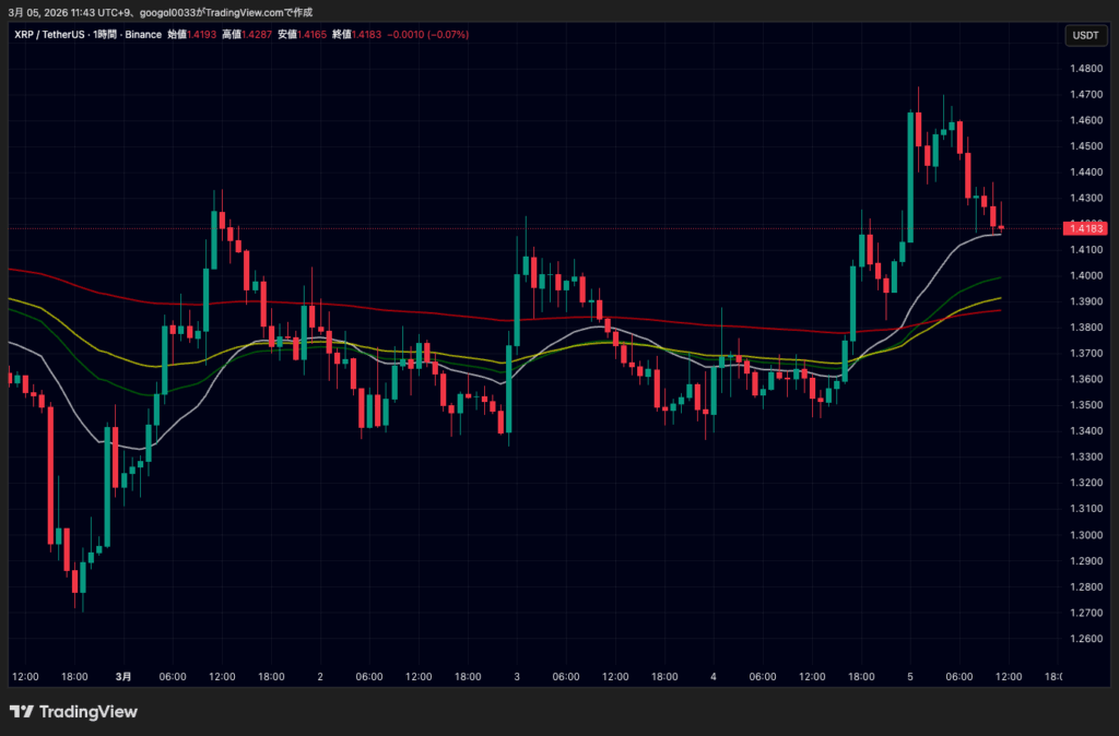 リップル(XRP)も上昇しました。3月4日0時時点では約1.361ドル付近で推移し、序盤に1.347ドルまで下落した後は切り返しました。同日中に1.469ドルまで上昇し、3月5日9時時点では約1.43ドル前後で推移しています。