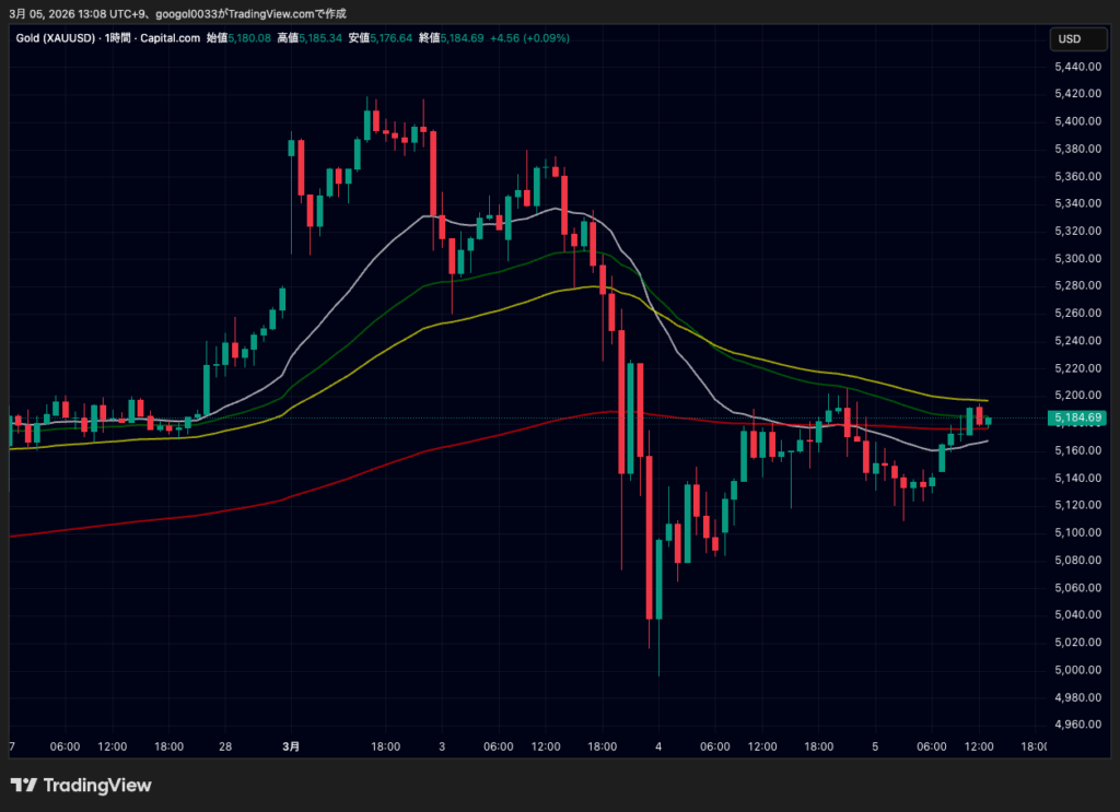 金(ゴールド)は5日、5100ドル台後半で推移しました。取引時間中には一時5195ドル付近まで上昇し、足元では5180ドル前後で推移しています。