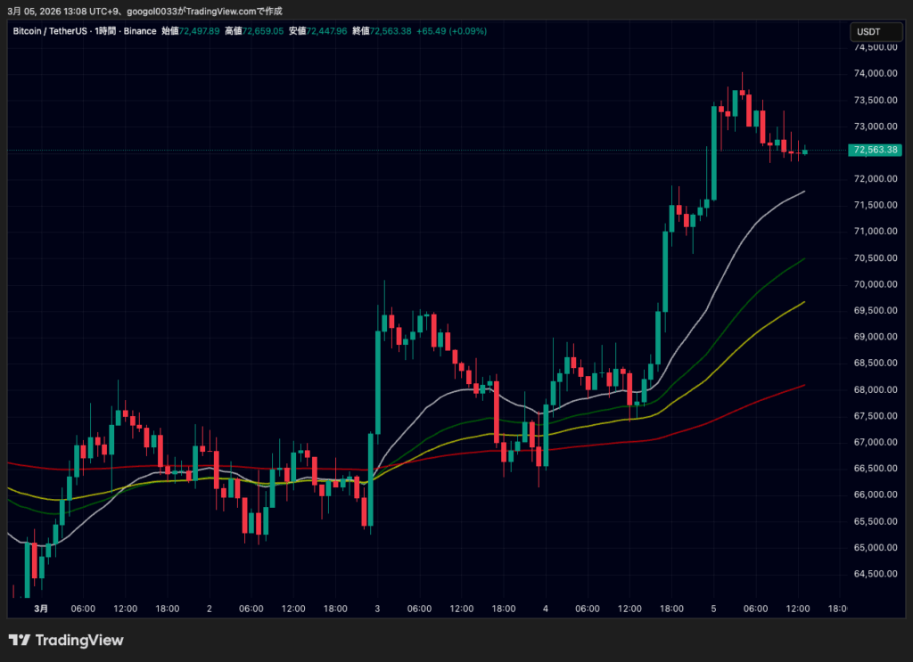 取引時間中には一時7万4000ドルまで高値を伸ばしましたが、その後はやや上値が重くなり、足元では7万2000ドル台から7万3000ドル付近で推移しています。