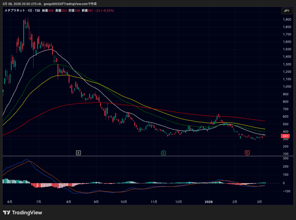 メタプラネット株は3月6日、349円で寄り付いた後、高値353円まで上昇する場面があったものの、その後は売りに押されて一時338円まで下落しました。