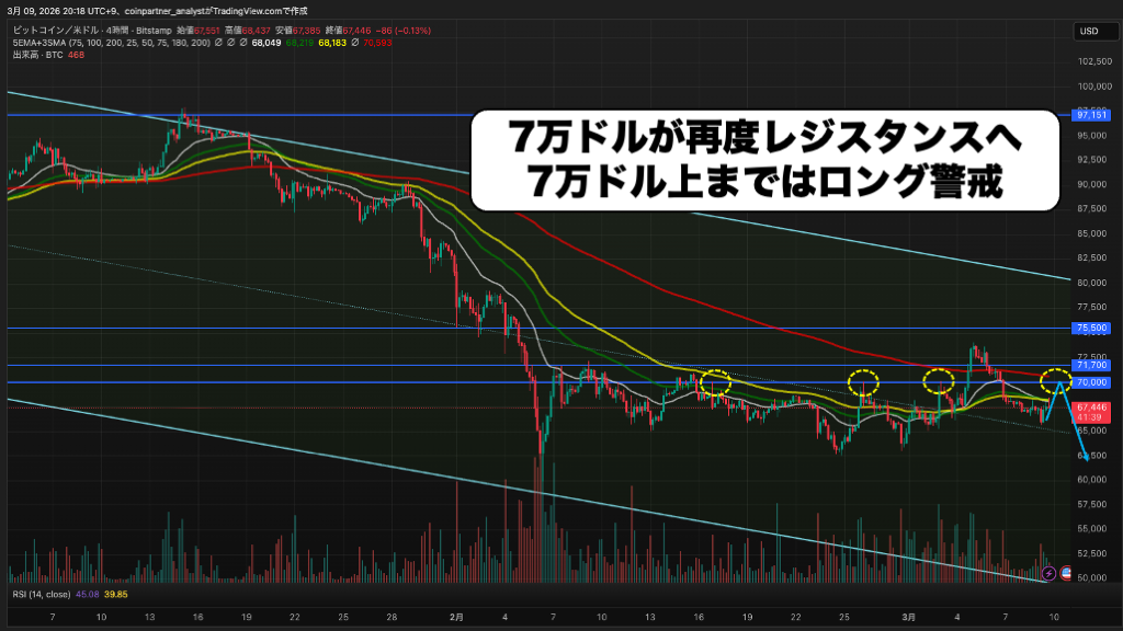 仮に7万ドル〜7万1700ドルを明確に上抜けた場合は、次のレジスタンスは7万5500ドル付近(4時間足の上位MA・水平ライン)となります。逆に、6万5000ドルを明確に割り込んだ場合は6万ドル付近までの下落に警戒が必要です。