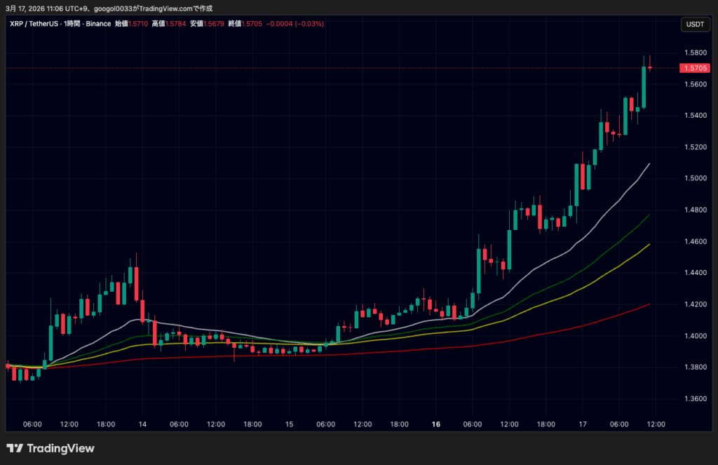17日午前の時点では1.57ドル前後となっており、他の主要銘柄と連動した上昇トレンドを描いています。