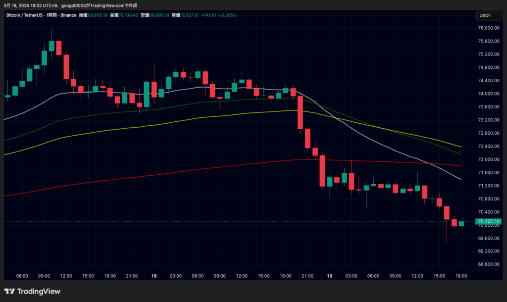FOMC後は売りが強まり、安値は7万0504ドルまで下落しました。高値から安値までの下げ幅は4000ドル超となり、7万5000ドル手前で上値を抑えられたあと、7万0000ドル前後まで一気に水準を切り下げた格好です。