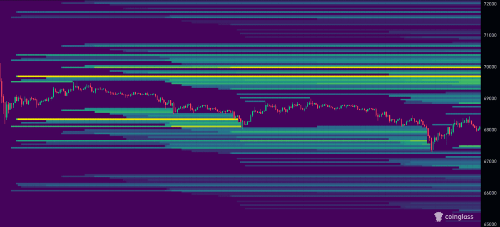 現在、最も警戒すべき清算ラインは6万8200ドル付近です。この価格帯には多くのストップロスが集中しているとみられ、ここを明確に下抜けた場合、連鎖的なロング清算を巻き込みながら、6万5900ドル付近まで一気に走る値動きが起きやすくなります。