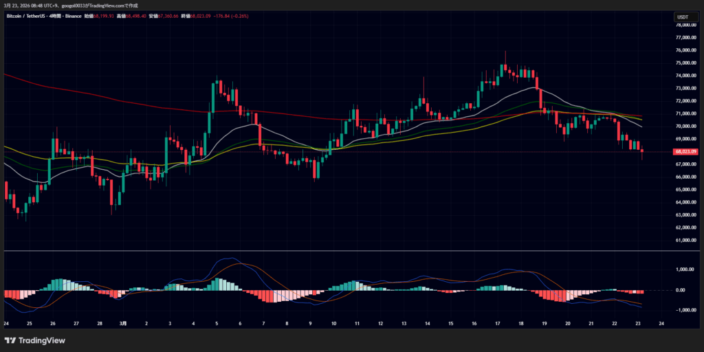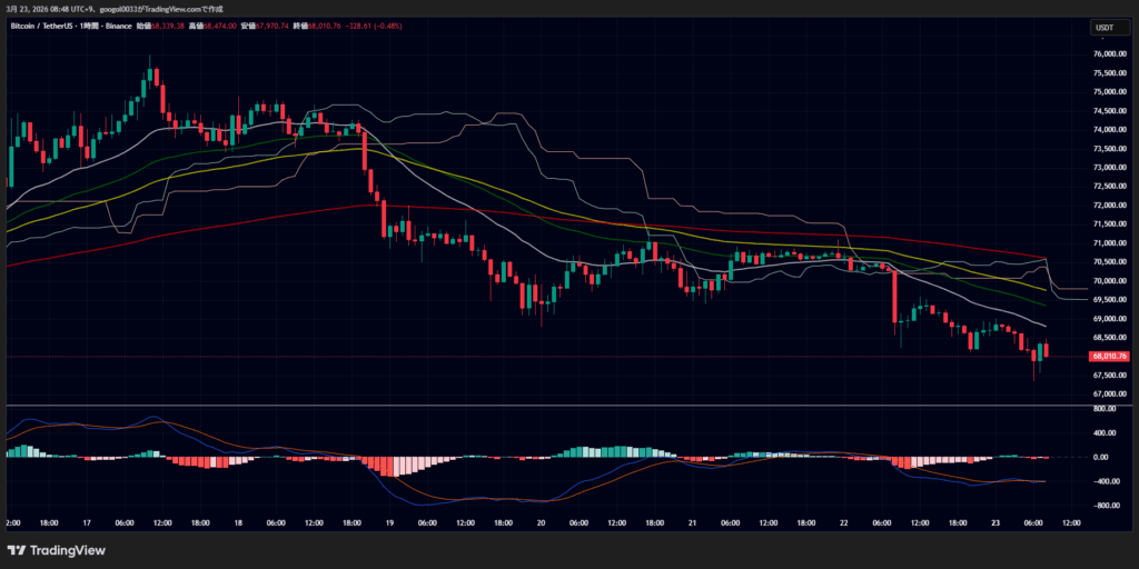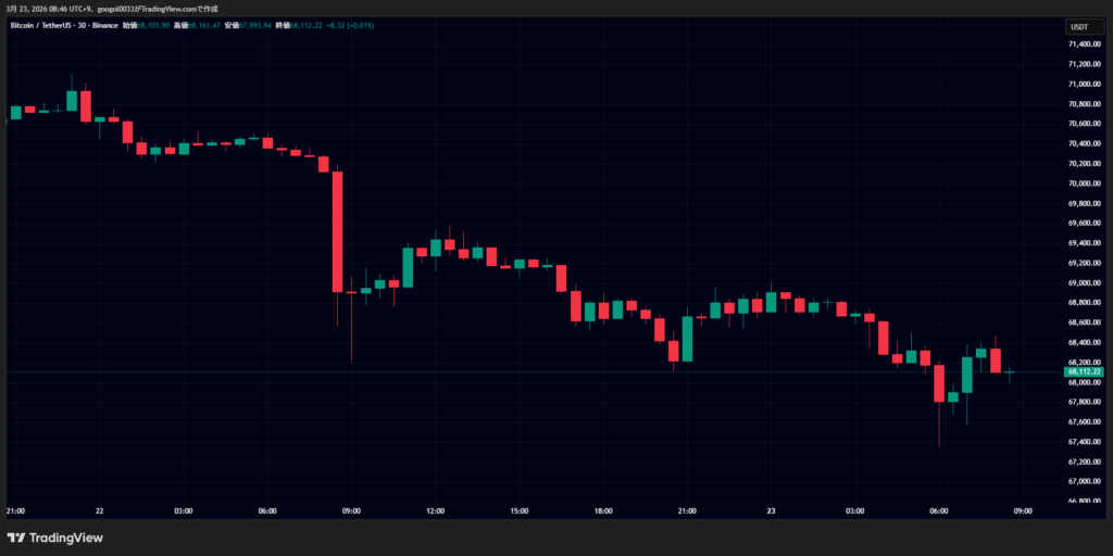 2026年3月23日午前8時時点のビットコイン(BTC)は、6万8373ドル付近で推移しています。直近24時間では約2.6%下落しており、週末の仮想通貨市場はリスクオフの展開を余儀なくされました。