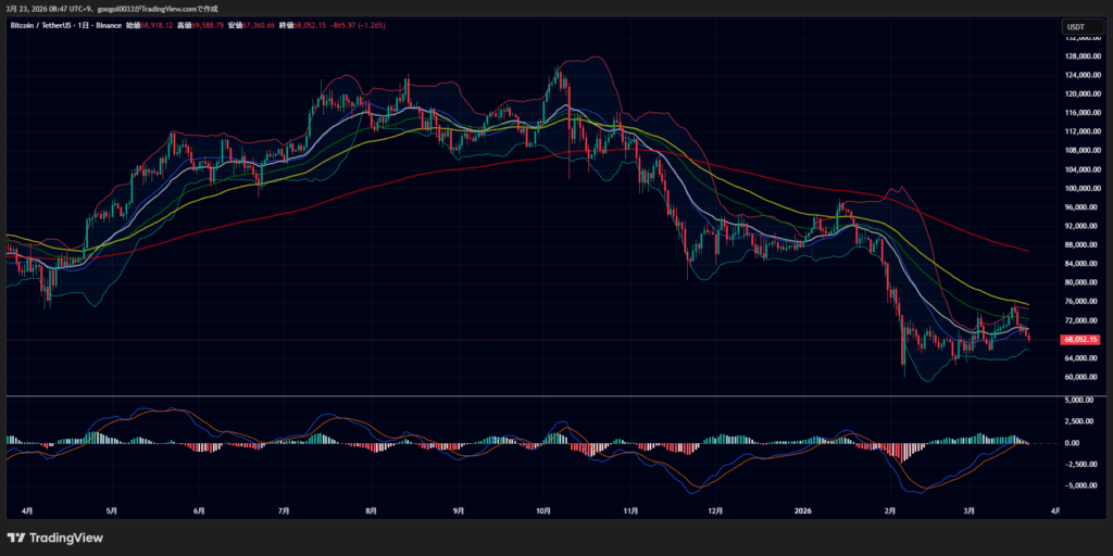 日足チャートでは、直近高値から反落したことで、現在は6万8200ドル付近での揉み合い局面にあります。10日EMA(7万313ドル)や200日SMA(9万2573ドル)など、主要な移動平均線の下方で推移しており、15本中13本の移動平均線が下落シグナルを示しています。