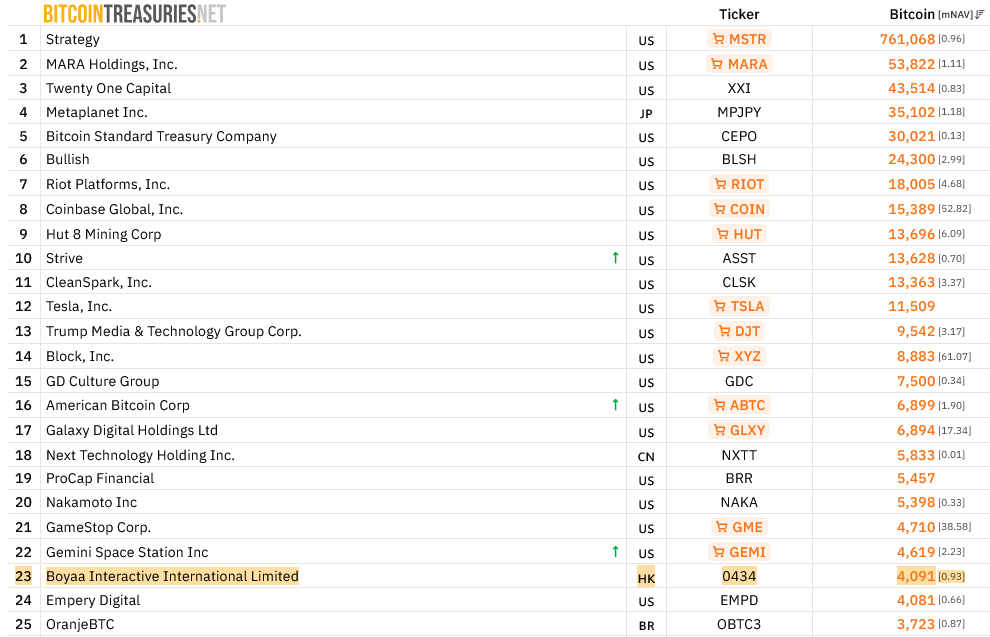 出典:BitcoinTreasuries ビットコインを保有する企業上位25社